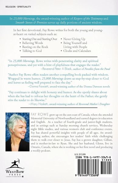 In 25,000 Mornings, the award-winning author of Keepers of the Testimony and Smooth Stones & Promises serves up daily portions of ancient wisdom. In her first devotional, Fay Rowe writes for both the young and young-at-heart on varied subjects such as: • Starting Out and Starting Over • Believing Words • Resting on the Rock • Talking to God • Never Giving Up • Being Yourself and Living with People • Clocks and Calendars "In 25,000 Mornings, Rowe writes with penetrating clarity and spiritual perceptiveness, and yet with a hint of playfulness that engages the reader." -Reverend Peter A Black, author of Parables from the Pond "Author Fay Rowe offers readers another compelling book packed with wisdom. Wrapped in warm humor, 25,000 Mornings draws us step-by-step closer to God and leaves us feeling well prepared to face the day." -Donna Fawcett, award-winning author of the Donna Dawson novels "Fay continues to delight with honesty and humor. As she openly shares about when she has had to refocus her thoughts on the heart of the Father, she gently stirs the reader to do likewise." -Mary Haskett, award-winning author of Reverend Mother's Daughter