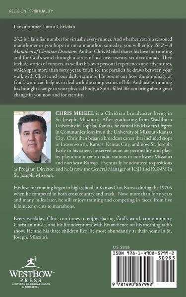 I am a runner. I am a Christian 26.2 is a familiar number for virtually every runner. And whether you're a seasoned marathoner or you hope to run a marathon someday, you will enjoy 26.2 - A Marathon of Christian Devotions. Author Chris Meikel shares his love for running and for God's word through a series of just over twenty-six devotionals. They include stories of runners, as well as his own personal experiences and adventures, which span more than forty years. You'll see the parallels he draws between your walk with Christ and your daily training. He points out how the simplicity of God's word can help us to deal with the complexities of life. And just as running has brought change to your physical body, a Spirit-filled life can bring about great change in you now and for eternity.