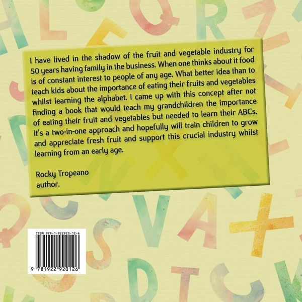 Rocky Tropeano: I have lived in the shadow of the fruit and vegetable industry for 50 years having family in the business. When one thinks about it food is of constant interest to people of any age. What better idea than to teach kids about the importance of eating their fruits and vegetables whilst learning the alphabet. I came up with this concept after not finding a book that would teach my grandchildren the importance of eating their fruit and vegetables but needed to learn their ABCs. It's a two-in-one approach and hopefully will train children to grow and appreciate fresh fruit and support this crucial industry whilst learning from an early age.