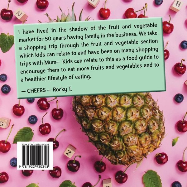 26 Letters - 2nd BOOK I have lived in the shadow of the fruit and vegetable market for 50 years having family in the business. We take a shopping trip through the fruit and vegetable section which kids can relate to and have been on many shopping trips with Mum - Kids can relate to this as a food guide to encourage them to eat more fruits and vegetables and to a healthier lifestyle of eating. -CHEERS- Rocky T.