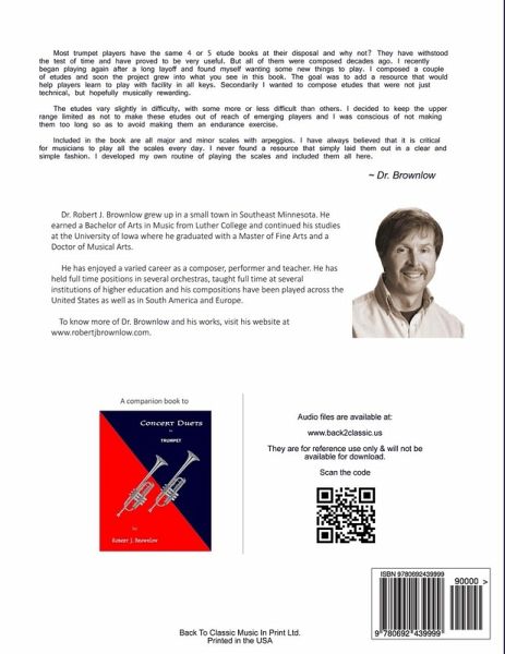 A companion book to: "Concert Duets for Trumpet" Words from the author: It is important that aspiring musicians become fluent in all of the major and minor keys. When I was a student, I was never entirely satisfied with the few choices of resources that contained well-written etudes in all keys. There have been some attempts but many of them have some standard keys missing, others are purely technical and lacking in musicality. Others were too high or too long and left them out of reach of emerging players. Further, finding a single resource that laid out all of the major and minor scales and arpeggios in a simpler manner was more difficult than it should have been. I did not need or want several pages of the same scale written out in a dozen or more rhythmic patterns and meters. As a result, I started playing the scales from memory in a manner that suited me. I have included these scales in this book. I also wrote them in such a way to include arpeggios at the end of each scale. This eliminates the need to have separate scales and arpeggio exercises. I recommend that all players from emerging ones to professionals play all the major and minor scales every day. Once the scales are memorized, the player will be ready to begin playing them with more speed. Eventually, all the scales can be played quite quickly and be completed in a very short time. At this point, you will find that many things may be easier for you as a player: sight-reading, transposition, or improvisation for example. THE ETUDES I have attempted to write etudes that are accessible enough for young, emerging players but still be enjoyable and challenging by even the most advanced players. I tried to avoid writing in a purely technical manner and made a concerted effort to make them musically rewarding, fun to play, and diverse in style and material. Of the 26 etudes, 24 of them are in a unique time signature. Only 4/4 and 6/8 time were used twice. While a few of the meters I chose are rarely used in common practice, it is still important that students are familiar with them. Too many etude books write in only a handful of the most common time signatures and as a result, the rhythmic patterns in the etudes tend to fall in similar and predictable patterns. I made a conscious effort to keep the length of every etude manageable. Some etudes are too long for younger players and they become tests of endurance rather than of technique and musicality. Along these same lines, I avoided writing notes above concert G5. This way, most of these etudes will be able to be played even by players whose range is still developing. TEMPO MARKINGS I did place a metronome marking at the beginning of every etude. They are merely suggestions. Some of them may need to be played slower, especially at first. Others you may choose to play faster than the suggested. OTHER BENEFITS Having been a teacher of music theory for a number of years, I cannot stress enough the importance and benefits of knowing all major and minor scales and arpeggios. The reasons for this are too numerous to explain here. What I can say is that having scales memorized, and being able to recall them quickly will help with the study of intervals, triads, aids melodic dictation skills and more. All of the aforementioned topics are an integral part of any higher education music theory course. To listen to the etudes, visit: www.back2classic.us.