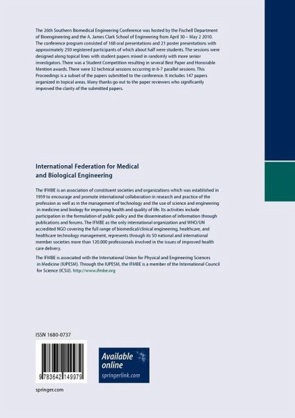 The 26th Southern Biomedical Engineering Conference was hosted by the Fischell Department of Bioengineering and the A. James Clark School of Engineering from April 30 - May 2 2010.. The conference program consisted of 168 oral presentations and 21 poster presentations with approximately 250 registered participants of which about half were students. The sessions were designed along topical lines with student papers mixed in randomly with more senior investigators. There was a Student Competition resulting in several Best Paper and Honorable Mention awards. There were 32 technical sessions occurring in 6-7 parallel sessions. This Proceedings is a subset of the papers submitted to the conference. It includes 147 papers organized in topical areas. Many thanks go out to the paper reviewers who significantly improved the clarity of the submitted papers.