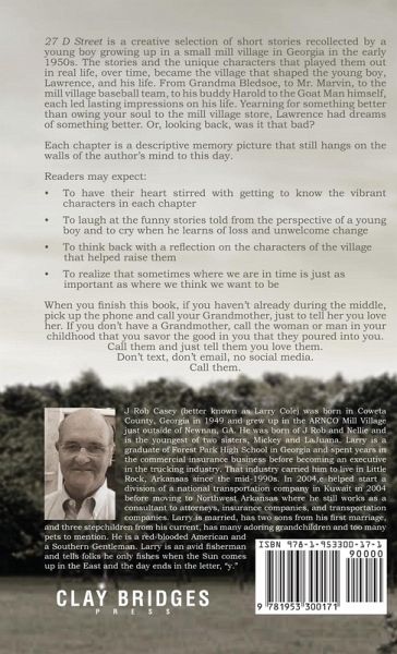 27 D Street is a creative selection of short stories recollected by a young boy growing up in a small mill village in Georgia in the early 1950s. The stories and the unique characters that played them out in real life, over time, became the village that shaped the young boy, Lawrence, and his life. From Grandma Bledsoe, to Mr. Marvin, to the mill village baseball team, to his buddy Harold to the Goat Man himself, each led lasting impressions on his life. Yearning for something better than owing your soul to the mill village store, Lawrence had dreams of something better. Or, looking back, was it that bad? Each chapter is a descriptive memory picture that still hangs on the walls of the author's mind to this day. Readers may expect: ¿ To have their heart stirred with getting to know the vibrant characters in each chapter ¿ To laugh at the funny stories told from the perspective of a young boy and to cry when he learns of loss and unwelcomed change ¿ To think back with a reflection on the characters of the village that helped raise them ¿ To realize that sometimes where we are in time is just as important as where we think we want to be When you finish this book, if you haven't already during the middle, pick up the phone and call your Grandmother, just to tell her you love her. If you don't have a Grandmother, call the woman or man in your childhood that you savor the good in you that they poured into you. Call them and just tell them you love them. Don't text, don't email, no social media. Call them.