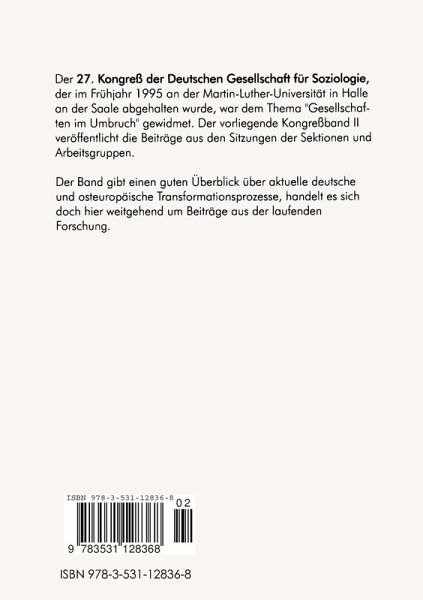I. Sektion Bildung und Erziehung.- Neue Schwerpunkte der Bildungssoziologie.- II. Sektion Biographieforschung.- Biographien, Konstruktionen der Kontinuierung und Novellierung.- III. Sektion Entwicklungssoziologie und Sozialanthropologie.- Gesellschaftliche Umbrüche und Longue Durée.- IV. Sektion Familien- und Jugendsoziologie.- Nichtkonventionelle Lebensformen - Im Osten wie im Westen?.- V. Sektion Frauenforschung.- Feministische Gesellschaftsanalyse und Demokratietheorie.- VI. Sektion Industrie- und Betriebssoziologie.- Arbeitsverhältnisse im Gesellschaftlichen Umbruch.- VII. Sektion Kultursoziologie.- Gemeinschaft und Gesellschaft im Zeitalter der Wende.- VIII. Sektion Medien- und Kommunikationssoziologie.- Kulturelle Umbrüche im Spiegel Massenmedialer Symbolpolitiken.- IX. Sektion Medizinsoziologie.- Medizinische Versorgung Zwischen Plan und Markt.- X. Sektion Methoden.- Methodologische Zugänge, Forschungsdesigns und Forschungstechniken zur Erfassung von Diskontinuierlichem Wandel und Systemtransformation.- XI. Sektion Migration und ethnische Minderheiten.- Migrationsfolgen und Migrationspolitiken.- XII. Sektion Modellbildung und Simulation.- Modelle der Räumlichen und Sozialen Mobilität.- XIII. Sektion Rechtssoziologie.- Transformationen des Rechts in Postkommunistischen Gesellschaften.- XIV. Sektion Soziale Probleme und Soziale Kontrolle.- Wandel von Abweichung und Kontrolle im Vereinigten Deutschland.- XV. Sektion Soziale Ungleichheit und Sozialstrukturanalyse.- Lebensbedingungen und Lebensweisen im Umbruch.- XVI. Sektion Sozialindikatoren.- Existenzsicherung und Lebensverhältnisse in den Osteuropäischen Ländern.- XVII. Sektion Sozialpolitik.- Veränderte Gesellschaftliche Anforderungen an die Sozialpolitik.- XVIII. Sektion Sportsoziologie.- Ideologieund Sozialer Wandel im Ost- und Westdeutschen Sport.- XIX. Sektion Soziologische Theorie.- Modernisierungstheorie und Sozialer Wandel in Europa.- XX. Sektion Sprachsoziologie.- Institutioneller Wandel und Alltagserfahrung.- XXI. Sektion Stadt- und Regionalsoziologie.- Berlin-Brandenburg - Transformationsprozesse in Ost und West.- XXII. Sektion Wirtschaftssoziologie.- Wirtschaftssysteme im Umbruch.- XXIII. Sektion Wissenschafts- und Technikforschung.- Wissenschafts- und Technikstandort Deutschland.- XXIV. AG Ost- und Ostmitteleuropasoziologie.- Umbruch in Ost-Mittel-Europa - Institutioneller Wandel und Historische Kontinuitäten.- XXV. AG Religionssoziologie.- Zum Wandel Religiöser Orientierungen in Ostdeutschland.- XXVI. AG Sozial- und Ideengeschichte der Soziologie.- Ethnische Segregation Versus Funktionale Diffhrenz1erung. Klassische Modernitätstheorien, Ethnosoziologie und die (Re-)Ethnisierung Sozialer Konflikte.- XXVII. AG Soziologie der Kindheit.- Umbrüche der Kindheit, Umbrüche der Kindheitsforschung.- XXVIII. AG Soziologie der Politik.- 'Vorwärts in die Barbarei?' - Progression und Regression Sozialer Konflikte.- XXIX. AG Soziologie und Ökologie.- Wie Beeinflusst die Ökologische Krise Gesellschaftliche Beziehungsmuster?.