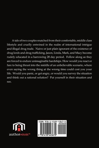 A tale of two couples snatched from their comfortable, middle class lifestyle and cruelly entwined in the realm of international intrigue and illegal drug trade. Naive or just plain ignorant of the existence of drug lords and drug trafficking, Jason, Linda, Mark, and Macy become rudely educated in a harrowing 28 day period. Follow along as they are forced to endure unimaginable hardships. How would you react or fare to being thrust into the middle of an unbelievable scenario, where even saying the wrong thing at the wrong time could cost you your life. Would you panic, or get angry, or would you survey the situation and think out a rational solution? Put yourself in their situation and see.