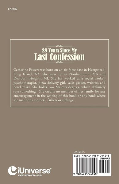Catherine Powers's work has been compared to Sharon Olds, Hal Sirowitz and Frank McCourt. "28 Years Since My Last Confession" contains poems and stories of loss and heartbreak but written with the humor and hope. "Poems that are both tender and wry with that rare ability to claim the reader's funny bone and heart all at once." Karen Totten, "We Can Fin Our Way"