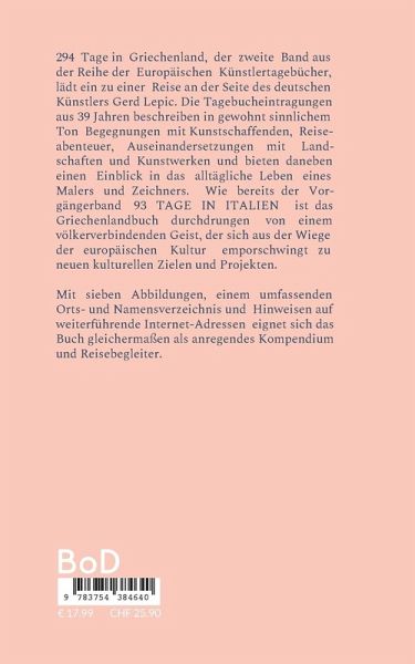 294 Tage in Griechenland, der zweite Band aus der Reihe der Europäischen Künstlertagebücher, lädt ein zu einer Reise an der Seite des deutschen Künstlers Gerd Lepic. Die Tagebucheintragungen aus 39 Jahren beschreiben in gewohnt sinnlichem Ton Begegnungen mit Kunstschaffenden, Reiseabenteuer, Auseinandersetzungen mit Landschaften und Kunstwerken und bieten daneben einen Einblick in das alltägliche Leben eines Malers und Zeichners. Wie bereits der Vorgängerband 93 TAGE IN ITALIEN ist das Griechenlandbuch durchdrungen von einem völkerverbindenden Geist, der sich aus der Wiege der europäischen Kultur emporschwingt zu neuen kulturellen Zielen und Projekten.Mit sieben Abbildungen, einem umfassenden Orts- und Namensverzeichnis und Hinweisen auf weiterführende Internet-Adressen eignet sich das Buch gleichermaßen als anregendes Kompendium und Reisebegleiter.