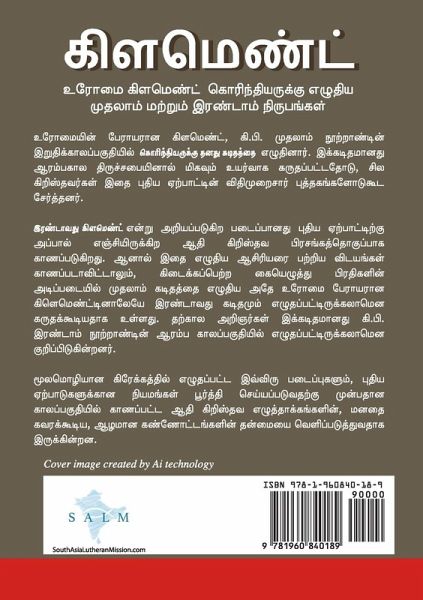 Clement, the Bishop of Rome, wrote his Letter to the Corinthians close to the end of the first century AD. The letter was highly respected in the early Church, and some Christians even included it among the canonical books of the New Testament. The work known as Second Clement is the earliest surviving Christian sermon outside of the New Testament. Although the work does not identify the author, the manuscripts that preserve the text identify it as written by the same Clement. Modern scholars date it to the first years of the second century AD. Both works, written originally in Greek, offer fascinating insights into the nature of the earliest Christian writings, at a time before the New Testament canon had been finalized. This edition provides a Tamil translation of both works.
