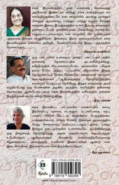 சங்க இலக்கியத்தில் நான் என்னைத் தொலைத்து அதனோடு இரண்டறக் கலந்து, சங்க காலத்திற்கும் சம காலத்திற்குமிடையே கால ஊஞ்சலில் அமர்ந்து முன்னும் பின்னும் ஆடியவாறு, பார்த்துப் பார்த்து எழுதிக் கோர்த்த கதைகள் இவை. இப்புத்தகத்தில் உள்ள இருபது கதைகளும் ஒன்றைப் போல் ஒன்றில்லாமல், வெவ்வேறு களங்களில் எழுதப்பட்டவையாகும். என் வாழ்வில் மிக முக்கியமான புத்தகமாக இதைக் கருதுகிறேன். இன்றைய இளம் தலைமுறையினர் சங்க இலக்கியத்தின் சுவையை அறிந்திட வேண்டுமென்பதே இந்தப் புத்தகத்தின் நோக்கமாகும். - வித்யா சுப்ரமணியம் ஒரு படைப்பின் உன்னதம், அதைப் படைப்பவர் அதில் தன்னைத் தொலைப்பதில் அடங்கியிருக்கிறது. சுசீந்திரத்தின் சிற்பங்களைப்போல, மல்லையின் பகீரதன் தவம் போல, அந்தப் பட்டியலில் வித்யாவின் இந்தத் தொகுப்பையும் சேர்க்க வேண்டும். கதைக்கான களங்கள், கதாபாத்திரங்கள் ஆகியவற்றைத் தேர்ந்தெடுத்ததில் கவனமும் பொறுப்பும் தெரிகிறது. இந்தக் கதைகளை அவர் எழுதியபோது ஒரு பெண்ணின் அழகில், நயத்தில், கம்பீரத்தில் தன்னைத் தொலைத்த ஆண்போல அவர் சங்க இலக்கியத்தின் வசீகரத்தில் தன்னை இழந்திருக்கக் கூடும் என்று தோன்றுகிறது. - திரு. மாலன்