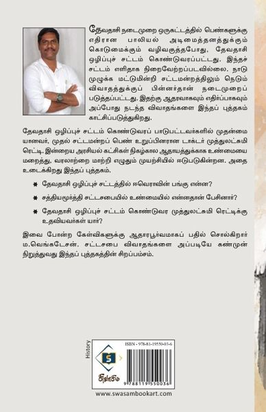தேவதாசி நடைமுறை ஒரு கட்டத்தில் பெண்களுக்கு எதிரான பாலியல் அடிமைத்தனத்துக்கும் கொடுமைக்கும் வழிவகுத்தபோது, தேவதாசி ஒழிப்புச் சட்டம் கொண்டுவரப்பட்டது. இந்தச் சட்டம் எளிதாக நிறைவேற்றப்படவில்லை. நாடு முழுக்க மட்டுமின்றி சட்டமன்றத்திலும் நெடும் விவாதத்துக்குப் பின்னர்தான் நடைமுறைப்படுத்தப்பட்டது. இந்தச் சட்டத்துக்கு ஆதரவாகவும் எதிர்ப்பாகவும் அப்போது நடந்த விவாதங்களை இந்தப் புத்தகம் காட்சிப்படுத்துகிறது. தேவதாசி ஒழிப்புச் சட்டம் கொண்டுவர பாடுபட்டவர்களில் முதன்மையானவர், முதல் சட்டமன்றப் பெண் உறுப்பினரான டாக்டர் முத்துலட்சுமி ரெட்டி. இன்றைய அரசியல் கட்சிகள் நிகழ்கால ஆதாயத்துக்காக உண்மையை மறைத்து, வரலாற்றை மாற்றி எழுதும் முயற்சியில் ஈடுபடுகின்றன. அதை உடைக்கிறது இந்தப் புத்தகம். * தேவதாசி ஒழிப்புச் சட்டத்தில் ஈவெராவின் பங்கு என்ன? * சத்தியமூர்த்தி சட்டசபையில் உண்மையில் என்னதான் பேசினார்? * தேவதாசி ஒழிப்புச் சட்டம் கொண்டுவர முத்துலட்சுமி ரெட்டிக்கு உதவியவர்கள் யார்? இவை போன்ற கேள்விக்கு ஆதாரபூர்வமாகப் பதில் சொல்கிறார் ம.வெங்கடேசன். சட்டசபை விவாதங்களை அப்படியே கண்முன் நிறுத்தியது இந்தப் புத்தகத்தின் சிறப்பம்சம்.