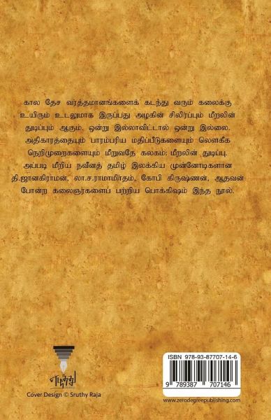 கால தேச வர்த்தமானங்களைக் கடந்து வரும் கலைக்கு உயிரும் உடலுமாக இருப்பது அழகின் சிலிர்ப்பும் மீறலின் துடிப்பும் ஆகும். ஒன்று இல்லாவிட்டால் ஒன்று இல்லை. அதிகாரத்தையும் பாரம்பரிய மதிப்பீடுகளையும் லௌகீக நெறிமுறைகளையும் மீறுவதே கலகம்; மீறலின் துடிப்பு. அப்படி மீறிய நவீனத் தமிழ் இலக்கிய முன்னோடிகளான தி.ஜானகிராமன், லா.ச. ராமாமிர்தம், கோபி கிருஷ்ணன், ஆதவன் போன்ற கலைஞர்களைப் பற்றிய பொக்கிஷம் இந்த நூல்.