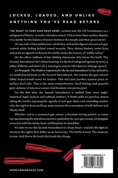 Locked, loaded, and unlike anything you've read before.The right to keep and bear arms-written into the US Constitution as a safeguard of liberty-is under relentless attack. This is more than a policy dispute; it's a battle for the balance of power between the people and their government.On one side: elitist politicians, celebrities, and media figures who preach gun control while hiding behind armed security. They distort history, twist facts, and push an agenda to disarm the public under the banner of "public safety."On the other: millions of law-abiding Americans who know the truth. The Second Amendment isn't about hunting; it's the final safeguard against tyranny, a pillar of liberty, and above all, a warning to anyone who dares to infringe upon it.2A Renegade: The Modern Argument for the Second Amendment is the definitive, no-holds-barred book on the Second Amendment-the volume the gun control lobby hoped would never be written. This isn't just another opinion piece or surface-level take. This is the most comprehensive, hard-hitting, and unapologetic defense of America's most vital freedom ever put to print.For the first time, the Second Amendment is tackled from every angle-historical, legal, tactical, and cultural. Author J. P. Rothe pulls no punches, demolishing the myths, exposing the agenda of anti-gun elites, and reminding readers why the right to keep and bear arms remains the cornerstone of self-defense and liberty itself.Whether you're a seasoned gun owner, a freedom-loving patriot, or someone questioning the relentless narrative pushed by the anti-gun crowd, 2A Renegade arms you with the clarity, facts, and firepower to stand firm.It's time to see the Second Amendment in sharp focus-and join the fight to preserve the rights that define us as Americans. The battle is here. The moment is now. And this is the book that leads the charge.