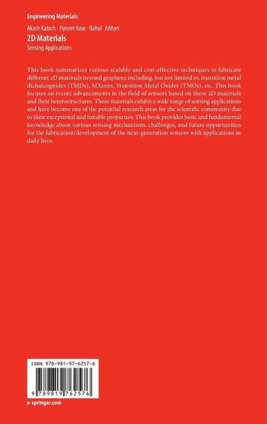 Scalable and cost-effective synthesis of 2D materials.- 2D-MoS2 and WS2-based chemical gas sensor.- Surface Engineered 2D TMD Materials for Advanced Wearable Biosensors.- Recent Developments in various 2D Material-based Gas Sensors: Diagnostic perspective of human exhalation.- Electrochemical sensors based on 2d materials (2dms) and their heterostructures.- 2D Materials for Gas Sensing Application.- Organic linkers and their modified nanoparticles for colorimetric monitoring devices for inorganic water contaminants.- 2D Material-Based Textile Sensors for Human Health Monitoring Applications.- 2D Materials- Applications in Photo Sensors.- 2D Materials' Sensing Mechanism.