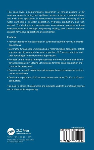 Features: Provides focus on the application of 2D semiconductors for environmental applications.Covers the fundamental understanding of material design, fabrication, defect engineering, physical and chemical properties of 2D semiconductors, and their advantages for environmental applications.Focuses on the reliable future perspectives and developments that lead to advanced research in utilizing 2D materials for large-scale exploration and commercial deployment.Explores an in-depth insight into various aspects and processes for environmental remediation.Details the importance of 2D semiconductors over other 0D, 1D, or 3D semiconductors. This book is aimed at researchers and graduate students in materials science and environmental engineering.