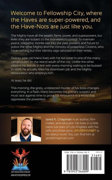 Welcome to Fellowship City, where the Haves are super-powered, and the Have-Nots are just like you. The Mighty have all the wealth, fame, power, and superpowers, but even they are subject to the monastery's control. To maintain peace, telepathic monks see into the past, present, and future to police the other Mighty and the minority of powerless Citizens, who have nothing but their identity tags tattooed on their wrists. Twenty-year-old Mario lives with his kid sister in one of the many camphouses on the island south of the city. Unlike the other citizens he stands in line with every morning waiting to be bussed to work, he actually likes his downtown job and the Mighty restaurateur who employs him. At least, he did. This morning, the grisly, undetected murder of his boss changes everything. In a flash, Mario becomes the primary suspect and must race against time to prove his innocence in a world that oppresses the powerless. Part READY PLAYER ONE. Part DIVERGENT. Part MINORITY REPORT. Totally Superpowered! 2HVØRHVNØT has fast-paced action, suspense, horror, and mature themes that are sure to keep readers on the edge of their seats. Get it today! Fair Warning: This is not your kids' superheroes book.