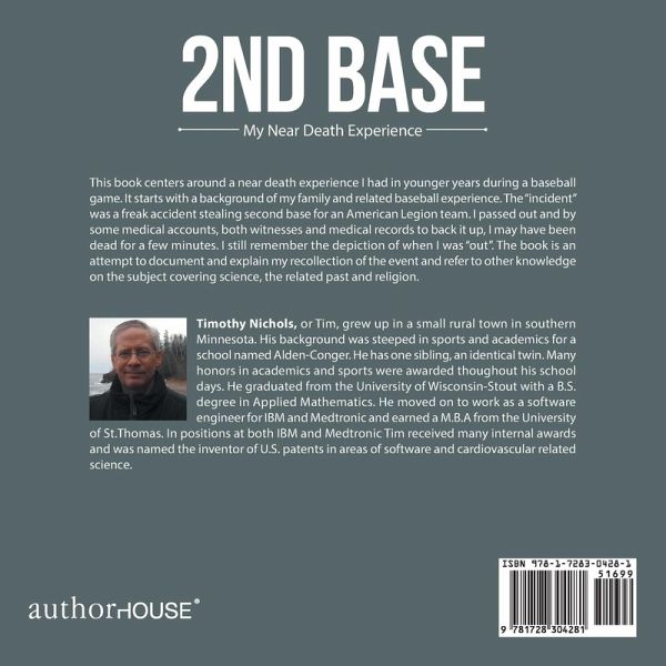 This book centers around a near death experience I had in younger years during a baseball game. It starts with a background of my family and related baseball experience. The "incident" was a freak accident stealing second base for an American Legion team. I passed out and by some medical accounts, both witnesses and medical records to back it up, I may have been dead for a few minutes. I still remember the depiction of when I was "out". The book is an attempt to document and explain my recollection of the event and refer to other knowledge on the subject covering science, the related past and religion.
