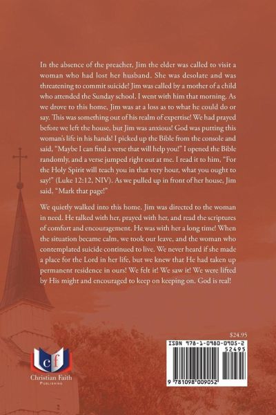 In the absence of the preacher, Jim the elder was called to visit a woman who had lost her husband. She was desolate and was threatening to commit suicide! Jim was called by a mother of a child who attended the Sunday school. I went with him that morning. As we drove to this home, Jim was at a loss as to what he could do or say. This was something out of his realm of expertise! We had prayed before we left the house, but Jim was anxious! God was putting this woman's life in his hands! I picked up the Bible from the console and said, "Maybe I can find a verse that will help you!" I opened the Bible randomly, and a verse jumped right out at me. I read it to him, "For the Holy Spirit will teach you in that very hour, what you ought to say!" (Luke 12:12, NIV). As we pulled up in front of her house, Jim said, "Mark that page!" We quietly walked into this home. Jim was directed to the woman in need. He talked with her, prayed with her, and read the scriptures of comfort and encouragement. He was with her a long time! When the situation became calm, we took our leave, and the woman who contemplated suicide continued to live. We never heard if she made a place for the Lord in her life, but we knew that He had taken up permanent residence in ours! We felt it! We saw it! We were lifted by His might and encouraged to keep on keeping on. God is real!