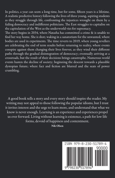 In politics, a year can seem a long time, but for some, fifteen years is a lifetime. A realistic predictive history following the lives of three young, aspiring students as they struggle through life, confronting the injustices wrought on them by a failing democracy and indifferent politicians. The East struggles to capitalise on the capitulation of the West as the underworld vies for supremacy. The story begins in 2034, where Natasha has committed a crime & is unable to find her way home. She is shot; waking in a sanatorium for the unwanted, where bodies are used in experiments. The time reverts to 2019, where young revellers are celebrating the end of term results before returning to reality, where events conspire against them changing their lives forever, as they wind their different paths through the gradual disintegration of democracy; eventually arriving at a crossroads, but the result of their decisions brings catastrophe. Numerous world events hasten the decline of society; beginning the descent towards a plausible dystopian future; where fact and fiction are blurred and the seats of power crumbling.