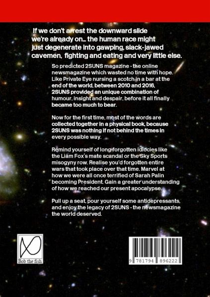 You may have noticed the world coming to an end. We certainly did: 2SUNS magazine - the scorchingly foul-mouthed online organ of current affairs which didn't waste any of its precious time with hope. Like Private Eye nursing a scotch in a bar at the end of the world, between 2010 and 2016, 2SUNS provided an unique combination of humour, insight and despair, before it all finally became too much to bear. Now for the first time, most of the words (largely incredibly strong swearwords) are collected together in a physical book, because 2SUNS was nothing if not behind the times in every possible way. Remind yourself of long-forgotten idiocies like the Liam Fox's mate scandal or the Sky Sports misogyny row. Realise you'd forgotten entire wars that took place over that time. Marvel at how we were all once terrified of Sarah Palin becoming President. Gain a greater understanding of how we reached our present apocalypse. Pull up a seat, pour yourself some antidepressants, and enjoy the legacy of 2SUNS - the newsmagazine the world deserved.