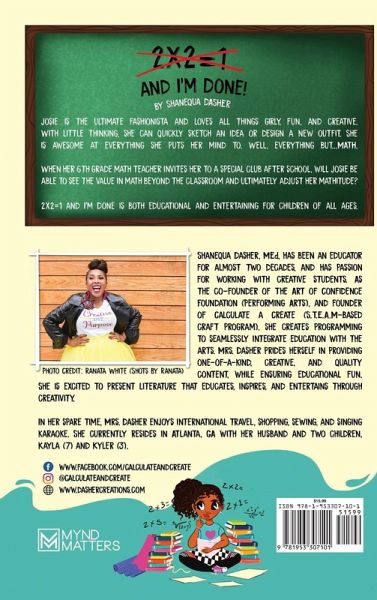 Josie is the ultimate fashionista and loves all things girly, fun, and creative. With little thinking, she can quickly sketch an idea or design a new outfit. She is awesome at everything she puts her mind to. Well, everything but...MATH. When Josie's 6th grade math teacher, Ms. Benson, invites her to a drama club meeting after school, Josie is excited to learn more. However, once there, Josie learns that math is a must! Will she decide she's officially done with math once and for all? Or, will Josie finally be able to see the value in math beyond the classroom and ultimately adjust her mathitude? 2x2=1 and I'm Done is both educational and entertaining for children of all ages.