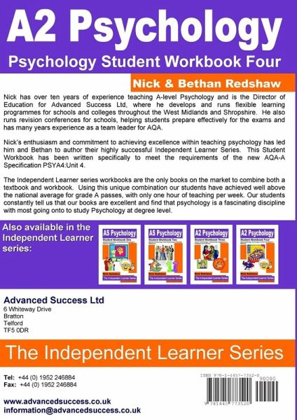 This book looks at issues related to depression and examines one area of psychology in action as well as looking at research methods. It has been specifically developed to give you all the information you need to be able to successfully sit the A2 exam. Book four includes textbook style content, self study activities and exam style questions. All the material is designed to help and guide you through the learning process and to develop strong evaluation and analysis skills.