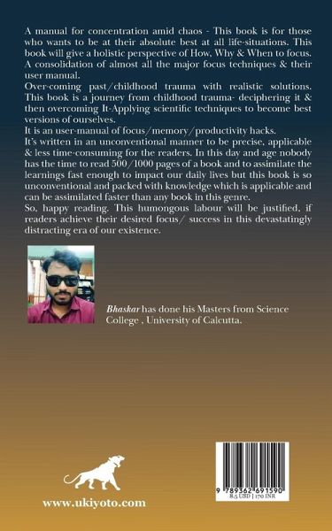 A manual for concentration amid chaos - This book is for those who wants to be at their absolute best at all life-situations. This book will give a holistic perspective of How, Why & When to focus. A consolidation of almost all the major focus techniques & their user manual. Over-coming past/childhood trauma with realistic solutions. This book is a journey from childhood trauma- deciphering it & then overcoming It-Applying scientific techniques to become best versions of ourselves. It is an user-manual of focus/memory/productivity hacks. It's written in an unconventional manner to be precise, applicable & less time-consuming for the readers. In this day and age nobody has the time to read 500/1000 pages of a book and to assimilate the learnings fast enough to impact our daily lives but this book is so unconventional and packed with knowledge which is applicable and can be assimilated faster than any book in this genre. So, happy reading. This humongous labour will be justified, if readers achieve their desired focus/ success in this devastatingly distracting era of our existence.