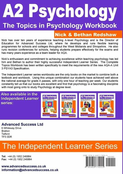 This book looks at the following key topics:-Relationships, Eating Behaviour & Gender. It has been specifically developed to give you all the information you need to be able to successfully sit the A2 exam. Book three includes textbook style content, self study activities and exam style questions. All the material is designed to help and guide you through the learning process and to develop strong evaluation and analysis skills.
