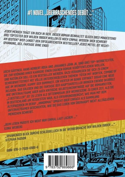 Uschi Gärtner, Hans Herbert Rosa und Johannes John jr. sind drei Top-Werbetexter, die zur Krönung ihrer Karriere einen eigenen Roman veröffentlichen wollen. Und natürlich soll es ein Bestseller werden. Dazu verabreden sie sich zu einem Schreibwettstreit mit völlig unterschiedlichen Themen: Töten mit Worten, Coming of Age im Weindorf, Kampf der Dummheit. Ein Vierter im Bunde erfindet sogar eine neue Religion. Das Erleben und die Fantasie der Hauptdarsteller bringen ebenso skurrile wie unterhaltsame aber auch kritische Selbsterkenntnisse auf die Romanseiten. 3 BESTSELLER ist zu lesen als Sittenmosaik der Werbeszene zu einer Zeit, als sie in Deutschland am heißesten war, als Erfahrungsbericht, wie man mit dem Älterwerden im Beruf unnormal umgeht oder einfach als Sammlung unterhaltsamer Geschichten, wie sie das Leben von überhaupt nicht alltäglichen Menschen schreibt.