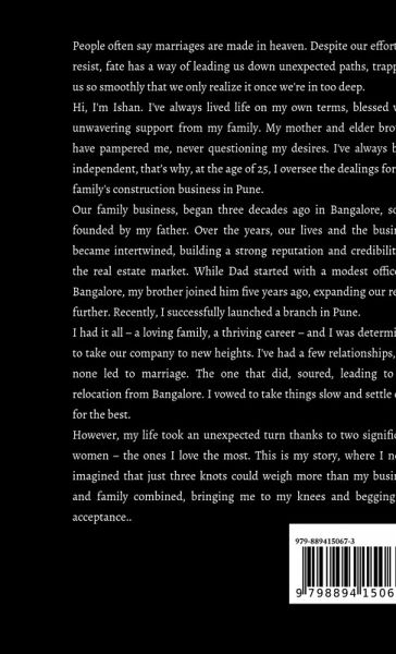 People often say marriages are made in heaven. Despite our efforts to resist, fate has a way of leading us down unexpected paths, trapping us so smoothly that we only realize it once we're in too deep. Hi, I'm Ishan. I've always lived life on my own terms, blessed with unwavering support from my family. My mother and elder brother have pampered me, never questioning my desires. I've always been independent, that's why, at the age of 25, I oversee the dealings for our family's construction business in Pune. Our family business, began three decades ago in Bangalore, solely founded by my father. Over the years, our lives and the business became intertwined, building a strong reputation and credibility in the real estate market. While Dad started with a modest office in Bangalore, my brother joined him five years ago, expanding our reach further. Recently, I successfully launched a branch in Pune. I had it all - a loving family, a thriving career - and I was determined to take our company to new heights. I've had a few relationships, but none led to marriage. The one that did, soured, leading to my relocation from Bangalore. I vowed to take things slow and settle only for the best. However, my life took an unexpected turn thanks to two significant women - the ones I love the most. This is my story, where I never imagined that just three knots could weigh more than my business and family combined, bringing me to my knees and begging for acceptance.