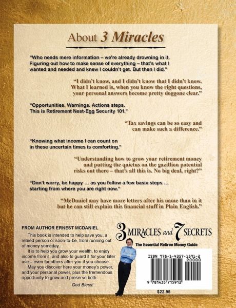 YOUR MONEY: This book is intended to help save you, a retired person or soon-to-be, from running out of money someday. It is to help you grow your wealth, to enjoy it, and also to preserve it for your later use - even for loved ones after you if you wish. ++++ YOUR POWER: Understanding powerful financial principles and the incredible forces you may marshal in your favor throughout retirement is essential to your success. ++++ YOUR KNOW-HOW: This special competence may help you avoid potential financial pitfalls on your own. It may also help you do a better job of choosing a financial professional who serves as your "guardian angel". ++++ YOUR WISDOM: More than mere information, what you'll find here is distilled wisdom. Most definitely, this is NOT for the financial hobbyist looking for the mythical down-and-dirty formula. ++++ YOUR BOOK: Buy 3 Miracles and discover your money's power, your personal power, and also the tremendous opportunity to grow and preserve both throughout your retirement.