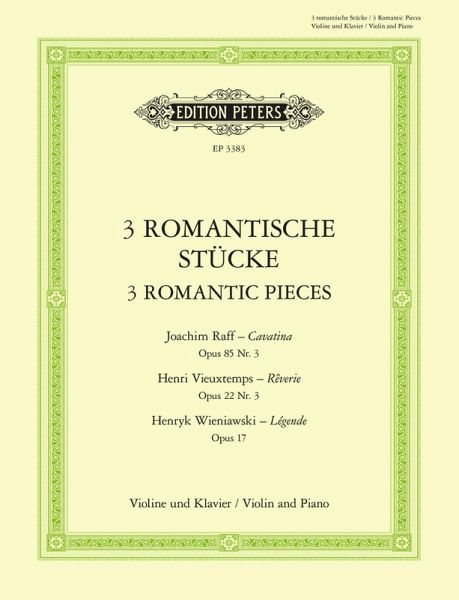 3 Romantic Pieces for violin and piano. Contains Joachim Raff's Cavatina (Op. 85, No. 3), Henri Vieuxtemps' Rêverie (Op. 22, No. 3) and Henryk Wieniawski's Légende (Op. 17). 3 romantische Stücke für Violine und Klavier. Enthalten sind Joachim Raffs Cavatina op. 85 Nr. 3, Henri Vieuxtemps' Rêverie op. 22 Nr. 3 und Henryk Wieniawskis Légende op. 17.