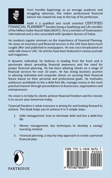From humble beginnings as an average academic and struggling salesman, this Indian professional financial advisor has clawed his way to the top of his profession. Aadil is a qualified and result oriented CERTIFIED FINANCIAL PLANNERCM besides being a Qualifying and Life member of the Million Dollar Round Table (MDRT). He is a member of Toastmasters International and is also associated with Speakers Bureau of Dubai. He conducts regular seminars on the Importance of Financial Planning. His views on insurance and financial services in the UAE have been much sought after and published in newspapers. He was once broadcasted on radio talk show in UAE. His articles have been featured in various journals and magazines. A dynamic individual, he believes in leading from the front and is passionate about spreading financial awareness and the need for proper financial planning. He has been advising clients on a range of financial services for over 20 years. He has strong business acumen in advising individual and corporate clients on securing their financial future based on their personal and professional goals. He motivates audiences worldwide to live a debt-free life, manage money in the most practical manner through presentations to businesses, organizations and entrepreneurs. His vision is to help his clients achieve financial freedom and his mission is to secure your tomorrow today. Financial freedom is what everyone is aiming for and looking forward to achieve. This book helps you to achieve it in 3 simple steps. 1. Debt management: how to eliminate debt and live a debt-free life 2. Money management: key techniques to develop a saving/investing mindset 3. Financial planning: a step-by-step approach to create a personal financial plan.