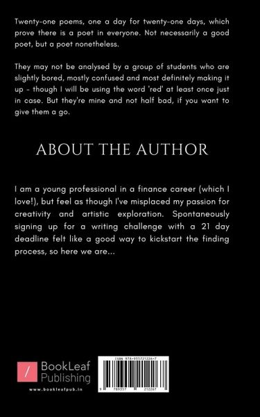 ""Twenty-one poems, one a day for twenty-one days, which prove there is a poet in everyone. Not necessarily a good poet, but a poet nonetheless. They may not be analysed by a group of students who are slightly bored, mostly confused and most definitely making it up - though I will be using the word 'red' at least once just in case. But they're mine and not half bad, if you want to give them a go.""