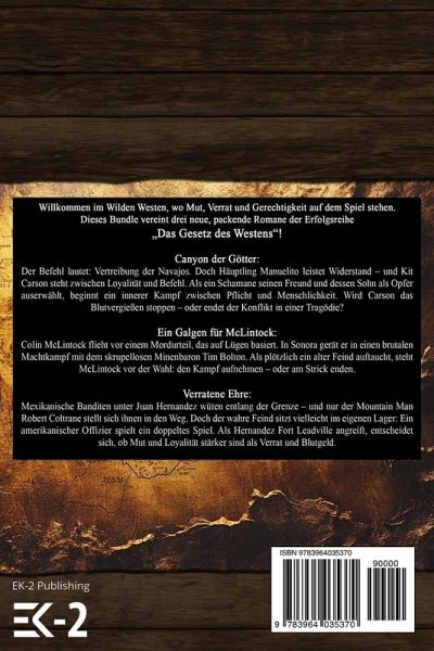 Drei Western für zwei! Willkommen im Wilden Westen, wo Mut, Verrat und Gerechtigkeit auf dem Spiel stehen. Dieses Bundle vereint drei packende Romane der Erfolgsreihe "Das Gesetz des Westens" - in einem Buch! Canyon der Götter: Der Befehl lautet: Vertreibung der Navajos. Doch Häuptling Manuelito leistet Widerstand - und Kit Carson steht zwischen Loyalität und Befehl. Als ein Schamane seinen Freund und dessen Sohn als Opfer auserwählt, beginnt ein innerer Kampf zwischen Pflicht und Menschlichkeit. Wird Carson das Blutvergießen stoppen - oder endet der Konflikt in einer Tragödie? Ein Galgen für McLintock: Colin McLintock flieht vor einem Mordurteil, das auf Lügen basiert. In Sonora gerät er in einen brutalen Machtkampf mit dem skrupellosen Minenbaron Tim Bolton. Als plötzlich ein alter Feind auftaucht, steht McLintock vor der Wahl: den Kampf aufnehmen - oder am Strick enden. Verratene Ehre: Mexikanische Banditen unter Juan Hernandez wüten entlang der Grenze - und nur der Mountain Man Robert Coltrane stellt sich ihnen in den Weg. Doch der wahre Feind sitzt vielleicht im eigenen Lager: Ein amerikanischer Offizier spielt ein doppeltes Spiel. Als Hernandez Fort Leadville angreift, entscheidet sich, ob Mut und Loyalität stärker sind als Verrat und Blutgeld. Über die Reihe "Das Gesetz des Westens" Erleben Sie regelmäßig knallharte Abenteuer aus dem Wilden Westen - von legendären Western-Autoren wie Alfred Wallon , Peter Dubina, John Gray und vielen mehr. EK-2 Publishing bringt mit dieser Reihe das Flair von Pulverdampf, rauen Siedlern und einsamen Revolverhelden direkt zu Ihnen nach Hause. Laden Sie den Colt, satteln Sie auf - und sichern Sie sich drei explosive Western in nur einem Band! Hinweis: Dieses Bundle enthält Neuauflagen gleichnamiger Romane.