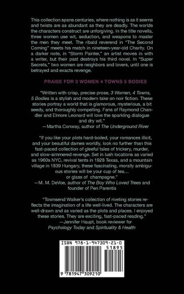 These twelve stories are rooted in foreign places, cemeteries, violence, and strong women. The worlds the characters construct are unforgiving. Their paths cross in tangled and sometimes deadly ways. In the title novella, three women use wit, seduction, and weapons to master the men they meet. The ribald reverend in "The Second Coming" meets his match in nineteen-year-old Charity. In "Super Secrets," two women are neighbors and lovers, until one is betrayed and exacts revenge. On a darker note, a crazed horse and a storm at sea shatter a fragile love in "Slashing at the Nets." Then, in "Storm Painter," an artist moves in with a writer, but their past destroys his third novel. Place is important. No one other than an Italian detective would find a clue in a singular tortellini. The New York sniper could only be trained by the Israeli Defense Force. 3 Women, 4 Towns, 5 Bodies is a short story collection spanning centuries, where nothing is as it seems and twists are as abundant as they are deadly.