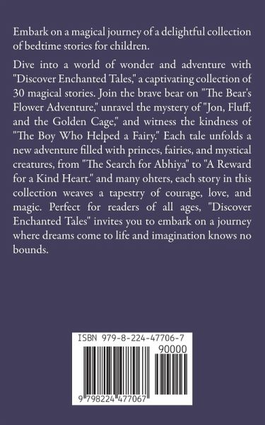 Embark on a magical journey of a delightful collection of bedtime stories for children. Dive into a world of wonder and adventure with "Discover Enchanted Tales," a captivating collection of 30 magical stories. Join the brave bear on "The Bear's Flower Adventure," unravel the mystery of "Jon, Fluff, and the Golden Cage," and witness the kindness of "The Boy Who Helped a Fairy." Each tale unfolds a new adventure filled with princes, fairies, and mystical creatures, from "The Search for Abhiya" to "A Reward for a Kind Heart." and many ohters, each story in this collection weaves a tapestry of courage, love, and magic. Perfect for readers of all ages, "Discover Enchanted Tales" invites you to embark on a journey where dreams come to life and imagination knows no bounds.