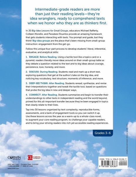 30 Big Idea Lessons for Small Groups provides an amazing framework, with a bank of engagement tools, that gets students interacting with texts. Follow this unique 4-part process to develop students' literal, inferential, evaluative, and analytical skills: Engage: Before Reading Students use a tactile tool like a topic card or a pyramid Discuss: During Reading Students read and mark up a short text Deep-See Think: After Reading Students re-read and revise their interpretations together Connect: After Reading Students begin to transfer their understandings to other texts