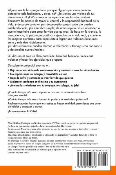 Transforma tu vida... ¡un hábito a la vez! ¿Alguna vez te has preguntado por qué algunas personas parecen obtenerlo todo fácilmente, y otras, no? ¿Te sientes una víctima de tus circunstancias? ¿Estás cansado de esperar a que tu vida cambie? Encuentra la manera de tomar el control y la responsabilidad total de tu vida, y descubre cómo un par de pequeños pasos cada día pueden cambiarlo todo. ¡En este libro simple, de ritmo rápido, vas a aprender lo que te hace falta para crear la vida que quieres! Se basa en la ciencia, la neurociencia, la psicología positiva y ejemplos de la vida real, y contiene los mejores ejercicios para impulsarte a lograr una vida más feliz, más sana y más rica rápidamente. ¡30 días realmente pueden marcar la diferencia si trabajas con constancia y desarrollas nuevos hábitos! Descubre tu potencial enorme y... Deja de ser una víctima de las circunstancias y comienza a crear tus circunstancias No esperes más un milagro y conviértete en uno Deja de sufrir y comienza a crear la vida que quieres Mejora tu confianza en ti mismo y tu autoestima ¡Mejora las relaciones con tu cónyuge, tus colegas, tu jefe! Sé más feliz y ten más éxito en tu vida ¿Cuánto tiempo más vas a esperar a que tus circunstancias cambien milagrosamente? ¿Cuánto tiempo más vas a ignorar tu poder y tu verdadero potencial? Realmente puedes hacer que tus sueños se hagan realidad, pero tienes que dejar de hablar y empezar a actuar.