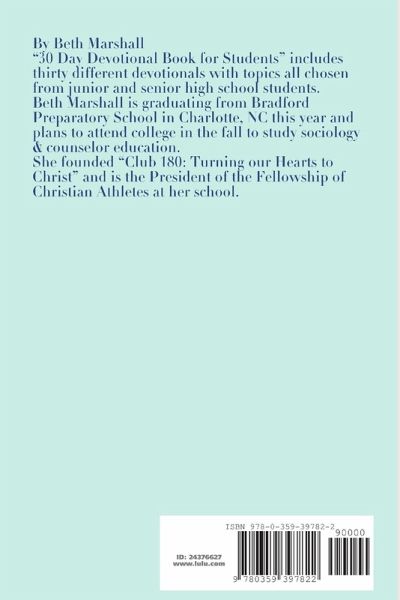 By Beth Marshall 30 Day Devotional Book for Students includes thirty different devotionals with topics all chosen from junior and senior high school students. Some of the topics include drama, parental relationships, college, teaches, empathy, commitment, relationships, strengths and weaknesses, blind faith, complete devotion, peer influence, social pressures, harmony, staying relaxed, sleep, stress, and more. Each devotional is very short to read (about one to three minutes) and includes a carefully chosen piece of Scripture. Beth Marshall is graduating from Bradford Preparatory School in Charlotte, NC this year (2019) and plans to attend college in the fall to study sociology & counselor education. She founded "Club 180: Turning our Hearts to Christ" and is the President of the Fellowship of Christian Athletes at her school. She is also heavily involved in her local Young Life ministry. You can follow Beth on instagram at @bethmarshall__. She would love to connect on a project or talk about life.