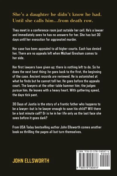 She’s a daughter he doesn’t know he has. Until she calls him...from death row. From USA Today bestselling author John Ellsworth comes another book so thrilling the pages all but turn themselves. Written as a standalone novel. Michael Gresham meets his lost daughter, Cache, in her prison cell. She is scheduled for execution in 30 days. Her other lawyers have given up; there is nothing left to do. On a hunch, Michael reviews ancient records. He is astonished at what he finds. He goes before the appeals court. The lawyers at the other table hammer him; the judges pursue him. He leaves with a heavy heart. With gathering speed, the days tick past. 30 Days of Justis is the story of a frantic father who happens to be a lawyer--but is he lawyer enough to save his child? Will there be a last-minute call? Or is he in Cache's life only as the last face she sees before it goes dark? A psychological thriller? Yes, definitely. A legal thriller? Yes, definitely. And so much more.