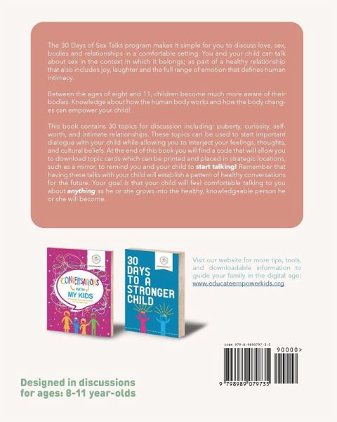 We are living in complicated and uncertain times. Our kids are surrounded by unhealthy or false messages about their bodies, relationships, and human sexuality. It is our job as parents to teach them what is true and what is not. It is vital that we begin these discussions to help them understand what healthy sexuality is, how special their bodies are, AND that they can come to us as parents to find answers to their questions. Using our new, second edition of 30 Days of Sex Talks books, know that you are setting the tone for the future; creating a home where your child can talk to you about anything. We know that the most important work we will ever do on earth is to teach our children to be good, honest, healthy, and kind people. Our homes are the first and most important schoolroom our children will have. This makes it the perfect place to have deep, meaningful conversations about important topics like love, healthy relationships, lasting marriages, sexual intimacy, and the dangers that threaten their future happiness. What's Included: This curriculum includes helpful directions, 30 simple, yet meaningful lessons, and an extensive glossary of over 130 terms to help you. Each lesson includes introductory points to consider, critical teaching information, scripture, powerful discussion questions, and additional resources to enrich your family's learning experience. Some topics even have an accompanying activity or sample scenario to inspire further conversation. Check out our other books that make great companions to our 30 Days of Sex Talks series, including How to Talk to Your Kids About Pornography, Conversations with My Kids: 30 Essential Family Discussions for the Digital Age, and 30 Days to a Stronger Child. For more great resources to guide your family, check out our website: educateempowerkids.org Our children's books that go beyond the surface: Messages About Me: Sydney's Story and Messages About Me: Wade's Story, guide parents and children through discussions about healthy body image. Then comes Noah's New Phone, an essential tool to steer conversations toward positive digital citizenship. And let's not forget Petra's Power to See: A Media Literacy Adventure, a journey that nurtures critical thinking in the realm of media.