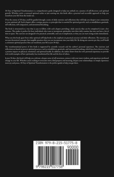 30 Days of Spiritual Transformation is a comprehensive guide designed to help you embark on a journey of self-discovery and spiritual growth. Whether you're a seasoned spiritual seeker or just starting out, this book offers a practical and accessible approach to help you transform your life from the inside out. Over the course of 30 days, you'll be guided through a series of daily exercises and reflections that will help you deepen your connection to your spiritual self. Each chapter offers a unique practice or principle that is essential for spiritual growth, such as mindfulness, gratitude, self-reflection, self-compassion, and intentional breathing. The book is structured in a way that is easy to follow, with each chapter providing a daily exercise that can be completed in just a few minutes. This makes it perfect for busy individuals who want to incorporate spirituality into their daily routine, but may not have a lot of time to spare. The exercises are designed to be practical, actionable, and easy to implement, so that you can start seeing results immediately. What sets this book apart from other spiritual self-help books is the emphasis on practical exercises and daily reflections. The exercises are not just theoretical concepts, but tangible practices that you can incorporate into your daily life. By doing one exercise per day, you'll build a consistent spiritual practice that can transform your life in just 30 days. The transformational power of this book is supported by scientific research and the author's personal experience. The exercises and reflections are based on proven spiritual practices, such as mindfulness, gratitude, and intentional breathing, which have been shown to have a positive impact on physical, emotional, and spiritual health. In addition, the author draws from her own personal experience to provide real-world examples of how spirituality has transformed her life and the lives of others. In just 30 days, this book will help you cultivate a deeper sense of self-awareness, connect with your inner wisdom, and experience profound change in your life. Whether you're seeking to overcome stress, find purpose and meaning, deepen your relationships, or simply experience more joy and peace, 30 Days of Spiritual Transformation is the perfect guide to help you get there.