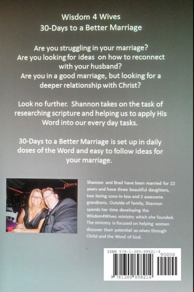 God has a plan for your marriage. Are you ready to learn more about it? Are you looking for ways to reconnect with your husband? Are you in a good Christian Marriage but looking for a deeper connection with Christ? Do you want to improve a struggling marriage? Join Shannon as she discovers what God has to say about marriage. She will help you put God's Word into daily practical use. 30 Days to a Better Marriage is arranged to provide daily doses of insightful scripture. It contains easy to follow ideas for your marriage and your growth in Christ. Please enjoy God's plan for a better marriage.