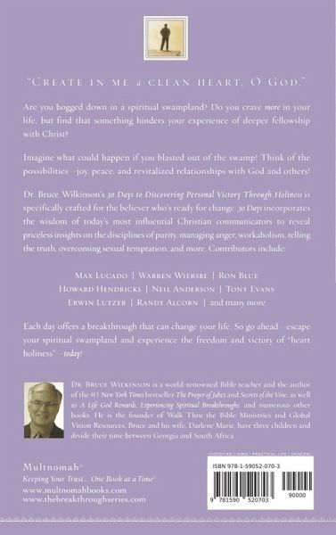 The companion to Set Apart, this book contains thirty encouraging readings, from a variety of well-known Christian pastors and speakers such as Charles Swindoll and Max Lucado, that lead you towards the best life God has for you: the life of holiness. Are you bogged down in a spiritual swampland? Do you crave more in your life, but find that something hinders your experience of deeper fellowship with Christ? Imagine what could happen if you blasted out fo the swamp! Think of the possibilities: joy, peace, and revitalized relationships with God and others! Dr. Bruce Wilkinson's 30 Days to Discovering Personal Victory Through Holiness is specifically crafted for the believer who's ready for changed. 30 Days incorporates the wisdom of today's most influential Christian communicators to reveal priceless insights on the disciplines of purity, managaing anger, workaholism, telling the truth, overcoming sexual temptation, and more. Contributors include: • Max Lucado • Warren Wiersbe • Ron Blue • Howard Hendricks • Neil Anderson • Tony Evans • Erwin Lutzer • Randy Alcorn • and many more Each day offers a breakthrough that can change your life. So go ahead-escape your spiritual swampland and experience the freedom and victory of "heart holiness"-today! Includes study questions after each chapter to apply its principles to your own life!