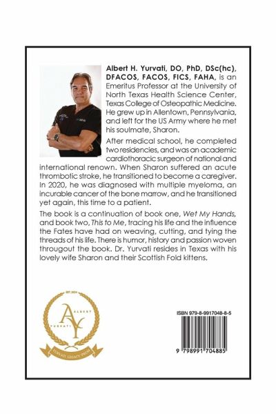 Autobiography: Albert H. Yurvati, DO, PhD, DSC(hc), DFACOS, FACOS, FICS, FAHA, is an Emeritus Professor at the University of North Texas Health Science Center, Texas College of Osteopathic Medicine. He grew up in Allentown, Pennsylvania, and left for the US Army, where he met his soulmate, Sharon. After medical school, he completed two residencies and was an academic cardiothoracic surgeon of national and international renown. When Sharon suffered an acute thrombotic stroke, he transitioned to become a caregiver. In 2020, he was diagnosed with multiple myeloma, an incurable cancer of the bone marrow, and he transitioned yet again, this time to a patient. The book is a continuation of book one, Wet My Hands, and book two, This to Me, tracing his life and the influence the Fates have had on weaving, cutting, and tying the threads of his life. There is humor, history and passion woven throughout the book. Dr. Yurvati resides in Texas with his lovely wife Sharon, and their Scottish Fold kittens.