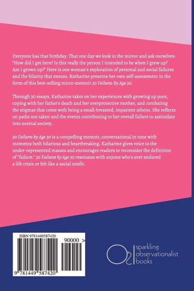 Everyone has that birthday. That one day we look in the mirror and ask ourselves: "How did I get here? Is this really the person I intended to be when I grew up? Am I grown up?" ¿Here is one woman's exploration of personal and social failures and the hilarity that ensues. Katharine presents her own self-assessment in the form of this best-selling micro-memoir 30 Failures By Age 30. Through each of the 30 chapters, Katharine takes on her experiences with growing up poor, coping with her father's death and her overprotective mother, and combating the stigmas that come with being a small-breasted, impatient atheist. She reflects on paths not taken and the events contributing to her overall failure to assimilate into normal society. ¿ 30 Failures by Age 30 is a compelling memoir, conversational in tone with moments both hilarious and heartbreaking. Katharine gives voice to the under-represented masses and encourages readers to reconsider the definition of "failure." 30 Failures by Age 30 resonates with anyone who's ever endured a life crisis or felt like a social misfit.