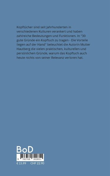 Kopftücher sind seit Jahrhunderten in verschiedenen Kulturen verankert und haben zahlreiche Bedeutungen und Funktionen. In "30 gute Gründe ein Kopftuch zu tragen - Die Vorteile liegen auf der Hand" beleuchtet die Autorin Mutter Hautberg die vielen praktischen, kulturellen und persönlichen Gründe, warum das Kopftuch auch heute nichts von seiner Relevanz verloren hat. Ob als Schutz vor Wind und Wetter, als Ausdruck von Tradition oder als modisches Statement - das Kopftuch ist vielseitig und bietet überraschend viele Vorteile. Mutter Hautberg nimmt den Leser mit auf eine Entdeckungsreise durch die Möglichkeiten des Kopftuchtragens, inspiriert von den Kulturen, die seit 2015 in Deutschland angekommen sind. Mit einem scharfsinnigen Blick für Details und einem tiefen Verständnis für Traditionen und Wandel zeigt sie, wie dieses Kleidungsstück nicht nur praktisch, sondern auch ein Ausdruck von Individualität und Respekt sein kann. Dieses Buch lädt dazu ein, den Wert und die Vielfalt des Kopftuches neu zu entdecken - und die Vorteile liegen dabei, wie die Autorin betont, ganz klar auf der Hand.