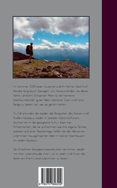 Im Sommer 2021 reisen Susanne und ihr Partner Gwill fünf Monate lang durch Georgien, um herauszufinden, ob dieses kleine Land am Schwarzen Meer so viel herzliche Gastfreundschaft, guten Wein, köstliches Essen und hohe Berge zu bieten hat, wie sie gehört hatten.Zu Fuß erkunden die beiden die Bergwelten des Kleinen und Großen Kaukasus, baden in eiskalten Gletscherflüssen, tauchen ein in die georgische Kultur, leben bei Einheimischen, die sie aufnehmen wie ihre eigene Familie, arbeiten auf einer Teeplantage, helfen bei der Weinernte und trinken hausgemachten Wein in kleinen Gasthäusern im wilden Kaukasus.Die Einwohner Georgiens beeindrucken sie immer wieder mit ihrer Lebensfreude, ihrer Lust zu teilen und ihnen das Beste von ihrem Land zukommen zu lassen.