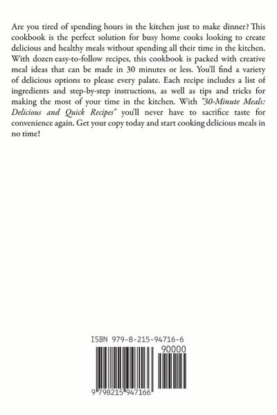 Are you tired of spending hours in the kitchen after a long day of work, only to be left with a mediocre meal? Look no further than "30-Minute Meals: Delicious and Quick Recipes." This cookbook is packed with delicious and easy-to-follow recipes that can be made in 30 minutes or less. From main dishes to sides, salads and desserts, you'll find a wide variety of options to suit your taste buds and dietary needs. With this cookbook, you'll be able to:Say goodbye to boring weeknight meals and hello to delicious and satisfying meals that won't break the bank Enjoy delicious meals without sacrificing your precious time Impress your family and friends with your cooking skills Enjoy the extra time you have to spend with them Get your copy today and start cooking delicious meals in no time!