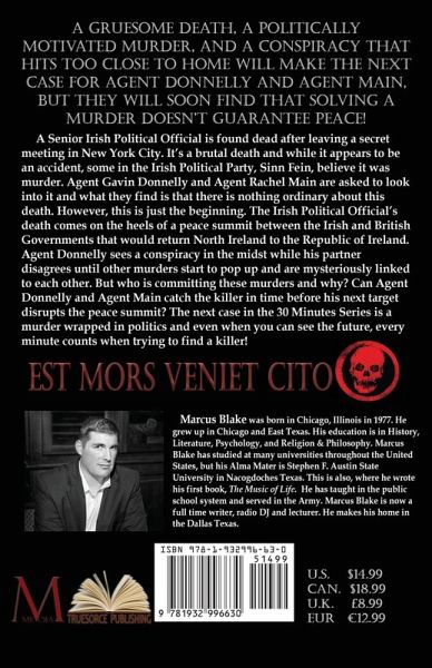 A Senior Irish Political Official is found dead after leaving a secret meeting in New York City. It’s a brutal death and while it appears to be an accident, some in the Irish Political Party, Sinn Fein, believe it was murder. Agent Gavin Donnelly and Agent Rachel Main are asked to look into it and what they find is that there is nothing ordinary about this death. However, this is just the beginning. The Irish Political Official’s death comes on the heels of a peace summit between the Irish and British Governments that would return North Ireland to the Republic of Ireland. Agent Donnelly sees a conspiracy in the midst while his partner disagrees until other murders start to pop up and are mysteriously linked to each other. But who is committing these murders and why? Can Agent Donnelly and Agent Main catch the killer in time before his next target disrupts the peace summit? The next case in the 30 Minutes Series is a murder wrapped in politics and even when you can see the future, every minute counts when trying to find a killer!